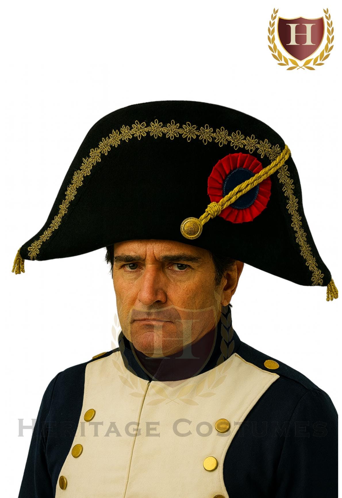 9️⃣ Napoleonic Bicorne Hat – Two-cornered felt-style hat with gold trim and side embellishments