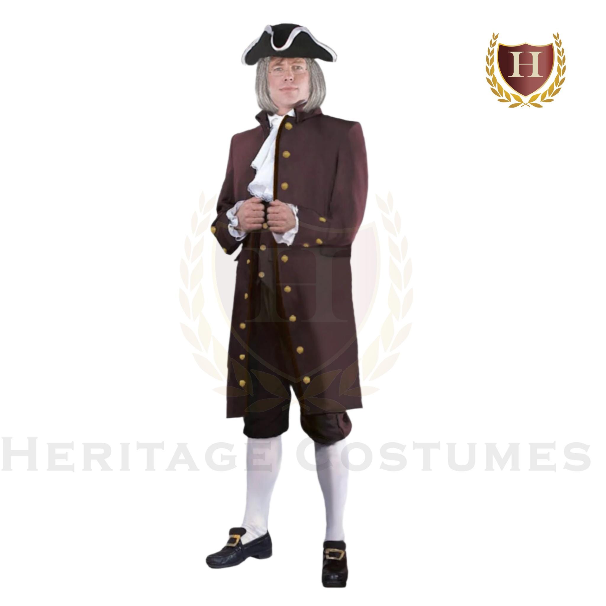 1. Men's Colonial Brown Frock Coat: A historically accurate replica of the type of coat worn by men during the colonial period in America. Constructed using high-quality polyester gaberdine fabric and fully lined with a poly/cotton broadcloth for added comfort and durability. The coat is specifically designed to be worn open and is intended to be worn with a waistcoat underneath. The coat features two working pockets, hidden by large pocket flaps, one on each side, decorative shank buttons on one side, and an embroidered, non-working buttonhole.