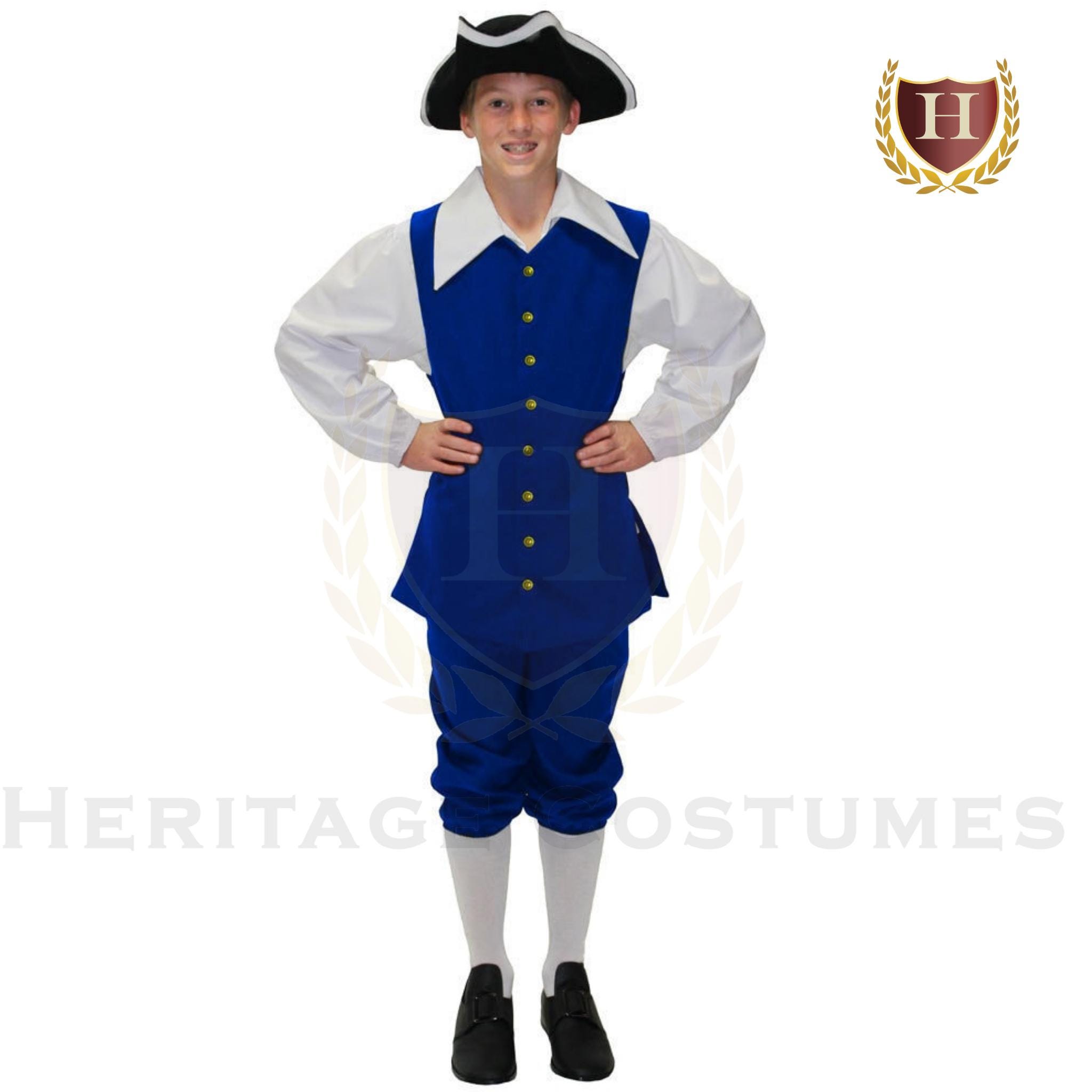 Base Costume: (3 PCS) A Long Sleeve Colonial Shirt, Blue Colonial Waistcoat, and Matching Colonial Knee Breeches.
