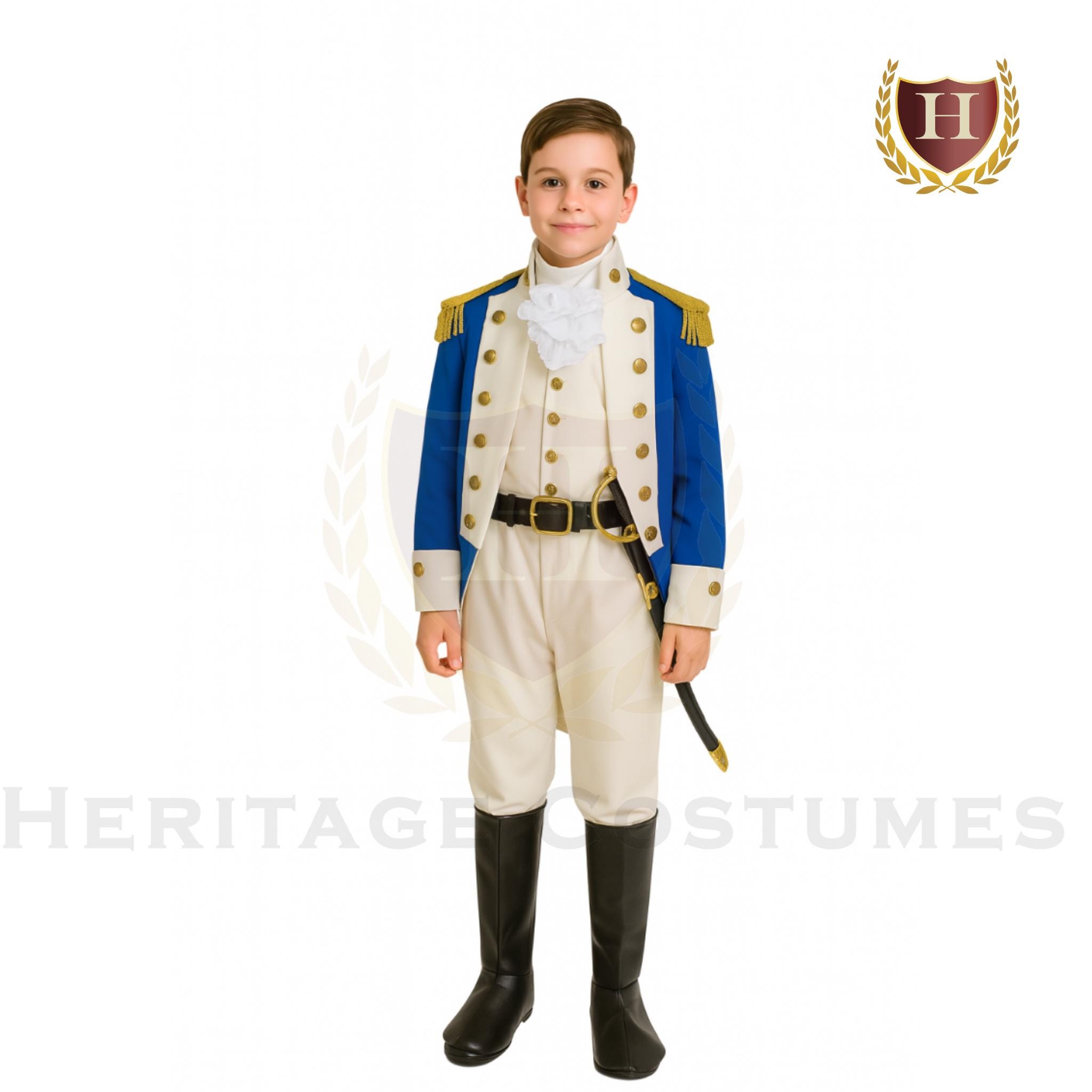 1. American Continental Navy uniform jacket - This is a formal military jacket worn by soldiers during the American Revolutionary War. It is made of a royal blue gaberdine fabric and features contrasting ivory lapels, facings, and tails. The jacket has gold buttons that are not pre-attached and must be attached using hitch pin clips, which are included. They are removable, with interchangeable buttons for easy adjustments and a more authentic look.