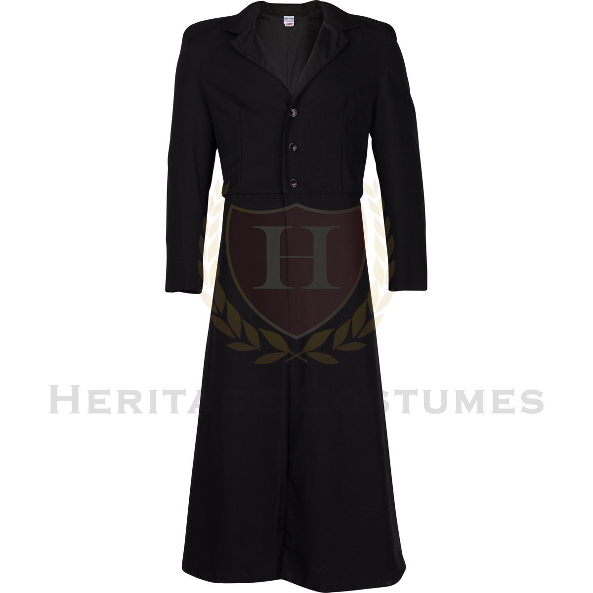 Crafted from durable black gaberdine and fully lined with a poly/cotton twill blend, this coat features a traditional cut for an authentic 19th-century silhouette.